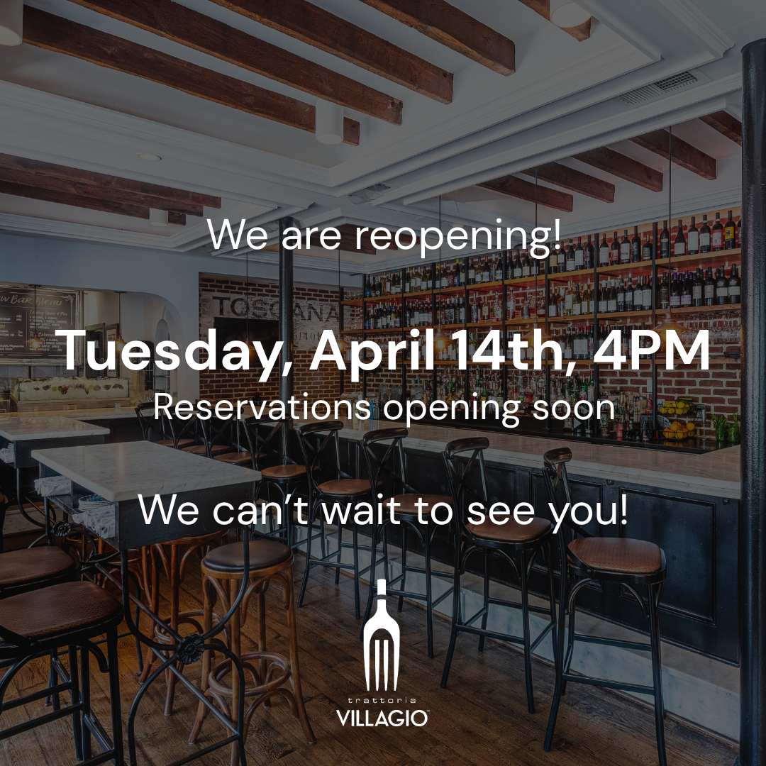 We’re excited to share that Trattoria Villagio will officially reopen on Tuesday, April 14th at 4:00 PM!